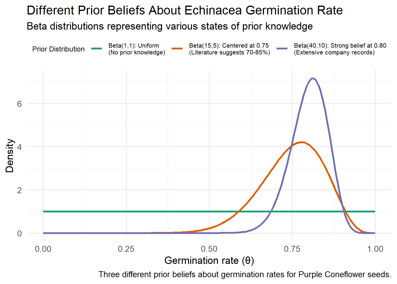 Imagine you’re evaluating a large shipment of Echinacea seeds. Rather than testing all at once, you test them in batches of 10 seeds as time and resources permit. Let’s watch how your beliefs evolve: