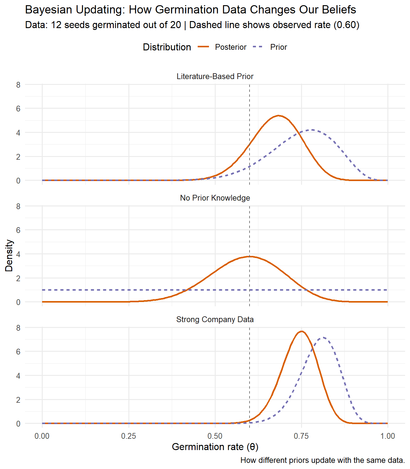 Starting point matters initially: We began with a prior centered around 75% germination (based on literature), but as data accumulate, we learn the true rate is closer to 60%
