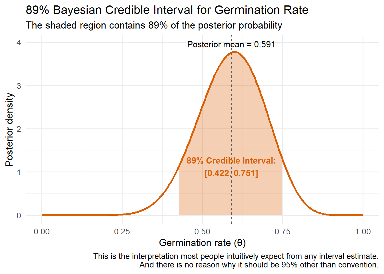 Direct probability statements about parameters: “There’s an 89% probability the effect is positive”.