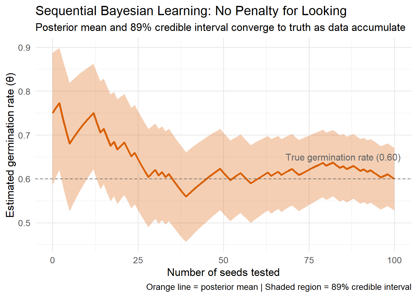 library(tidyverse)library(knitr)set.seed(456)# Simulate testing 100 seeds total from a batch with 60% germination raten_seeds <-100true_germ_rate <-0.60germinations <-rbinom(n_seeds, 1, true_germ_rate)# Start with a weakly informative prior based on literature: Beta(15,5)# This represents belief that Echinacea typically germinates around 75%alpha <-15# prior "germinations"beta <-5# prior "failures"# Create a dataframe to track how our beliefs evolveposterior_evolution <-tibble(seeds_tested =0:n_seeds,alpha_param =numeric(n_seeds +1),beta_param =numeric(n_seeds +1),mean =numeric(n_seeds +1),lower =numeric(n_seeds +1),upper =numeric(n_seeds +1))# Record initial priorposterior_evolution$alpha_param[1] <- alphaposterior_evolution$beta_param[1] <- betaposterior_evolution$mean[1] <- alpha / (alpha + beta)posterior_evolution$lower[1] <-qbeta(0.055, alpha, beta)posterior_evolution$upper[1] <-qbeta(0.945, alpha, beta)# Update beliefs after each seed test# This is the sequential update formula: α_new = α_old + germinated, β_new = β_old + failedfor (i in1:n_seeds) {if (germinations[i] ==1) { alpha <- alpha +1# observed a germination } else { beta <- beta +1# observed a failure }# Record the updated posterior posterior_evolution$alpha_param[i+1] <- alpha posterior_evolution$beta_param[i+1] <- beta posterior_evolution$mean[i+1] <- alpha / (alpha + beta) posterior_evolution$lower[i+1] <-qbeta(0.055, alpha, beta) posterior_evolution$upper[i+1] <-qbeta(0.945, alpha, beta)}# Visualize the evolution of our beliefsggplot(posterior_evolution, aes(x = seeds_tested)) +geom_ribbon(aes(ymin = lower, ymax = upper), fill ="#d95f02", alpha =0.3) +geom_line(aes(y = mean), color ="#d95f02", linewidth =1.2) +geom_hline(yintercept = true_germ_rate, linetype ="dashed", color ="grey40") +annotate("text", x =85, y = true_germ_rate +0.05, label ="True germination rate (0.60)", size =4, color ="grey40") +labs(title ="Sequential Bayesian Learning: No Penalty for Looking",subtitle ="Posterior mean and 89% credible interval converge to truth as data accumulate",x ="Number of seeds tested",y ="Estimated germination rate (θ)",caption ="Orange line = posterior mean | Shaded region = 89% credible interval" ) +theme_minimal(base_size =13)