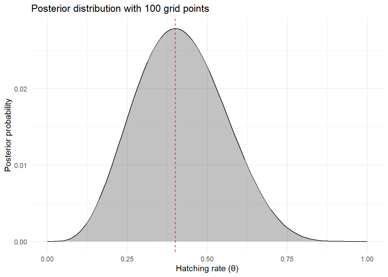 library(ggplot2)# Define a grid of possible hatching rates from 0 to 1theta_grid <-seq(from =0, to =1, length.out =100)# Prior options:prior_flat <-rep(1, 100) # Uninformative (flat)prior_conservative <-dbeta(theta_grid, 5, 5) # Moderate rates likelyprior_optimistic <-dbeta(theta_grid, 8, 2) # High rates likelyprior_skeptical <-dbeta(theta_grid, 2, 8) # Low rates likely# 👉 CHANGE THIS LINE to try different priors:prior <- prior_flat # Likelihood: how likely is observing 4/10 for each possible θ?# Observed data: 4 hatched out of 10 eggssuccesses <-4trials <-10observed_rate <- successes / trialslikelihood <-dbinom(successes, size = trials, prob = theta_grid)# Posterior ∝ Likelihood × Prior, then normalizeposterior <- likelihood * priorposterior <- posterior /sum(posterior)# Visualize the posterior distributiondata.frame(theta = theta_grid, posterior = posterior) |>ggplot(aes(x = theta, y = posterior)) +geom_line() +geom_area(alpha =0.3) +# Dashed red line = observed rate (from data), stays fixed# Shows how different priors shift the posterior relative to observed datageom_vline(xintercept = observed_rate, linetype ="dashed", color ="red") +labs(x ="Hatching rate (θ)",y ="Posterior probability",title ="Posterior distribution with 100 grid points") +theme_minimal()
