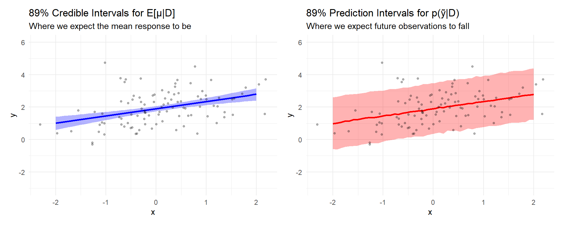 library(patchwork)# Create new data for predictionnewdata <-data.frame(x =seq(-2, 2, length.out =50))# Get both types of intervalsepred_intervals <- newdata |>add_epred_draws(fit) |>median_qi(.epred, .width =0.89)pred_intervals <- newdata |>add_predicted_draws(fit) |>median_qi(.prediction, .width =0.89)# Plot credible intervals (for mean response)p1 <-ggplot(epred_intervals, aes(x = x, y = .epred)) +geom_ribbon(aes(ymin = .lower, ymax = .upper), alpha =0.3, fill ="blue") +geom_line(color ="blue", size =1) +geom_point(data = data, aes(x = x, y = y), alpha =0.3, size =1) +labs(title ="89% Credible Intervals for E[μ|D]",subtitle ="Where we expect the mean response to be",y ="y") +theme_minimal() +coord_cartesian(ylim =c(-3, 6))# Plot prediction intervals (for observations)p2 <-ggplot(pred_intervals, aes(x = x, y = .prediction)) +geom_ribbon(aes(ymin = .lower, ymax = .upper), alpha =0.3, fill ="red") +geom_line(color ="red", size =1) +geom_point(data = data, aes(x = x, y = y), alpha =0.3, size =1) +labs(title ="89% Prediction Intervals for p(ỹ|D)",subtitle ="Where we expect future observations to fall",y ="y") +theme_minimal() +coord_cartesian(ylim =c(-3, 6))p1 + p2