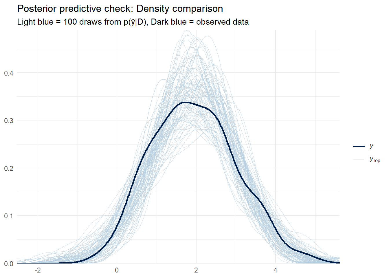 library(bayesplot)# Extract posterior predictive samplesy_rep <-posterior_predict(fit)# Compare distribution of observed vs. simulated datappc_dens_overlay(y, y_rep[1:100, ]) +labs(title ="Posterior predictive check: Density comparison",subtitle ="Light blue = 100 draws from p(ỹ|D), Dark blue = observed data") +theme_minimal()