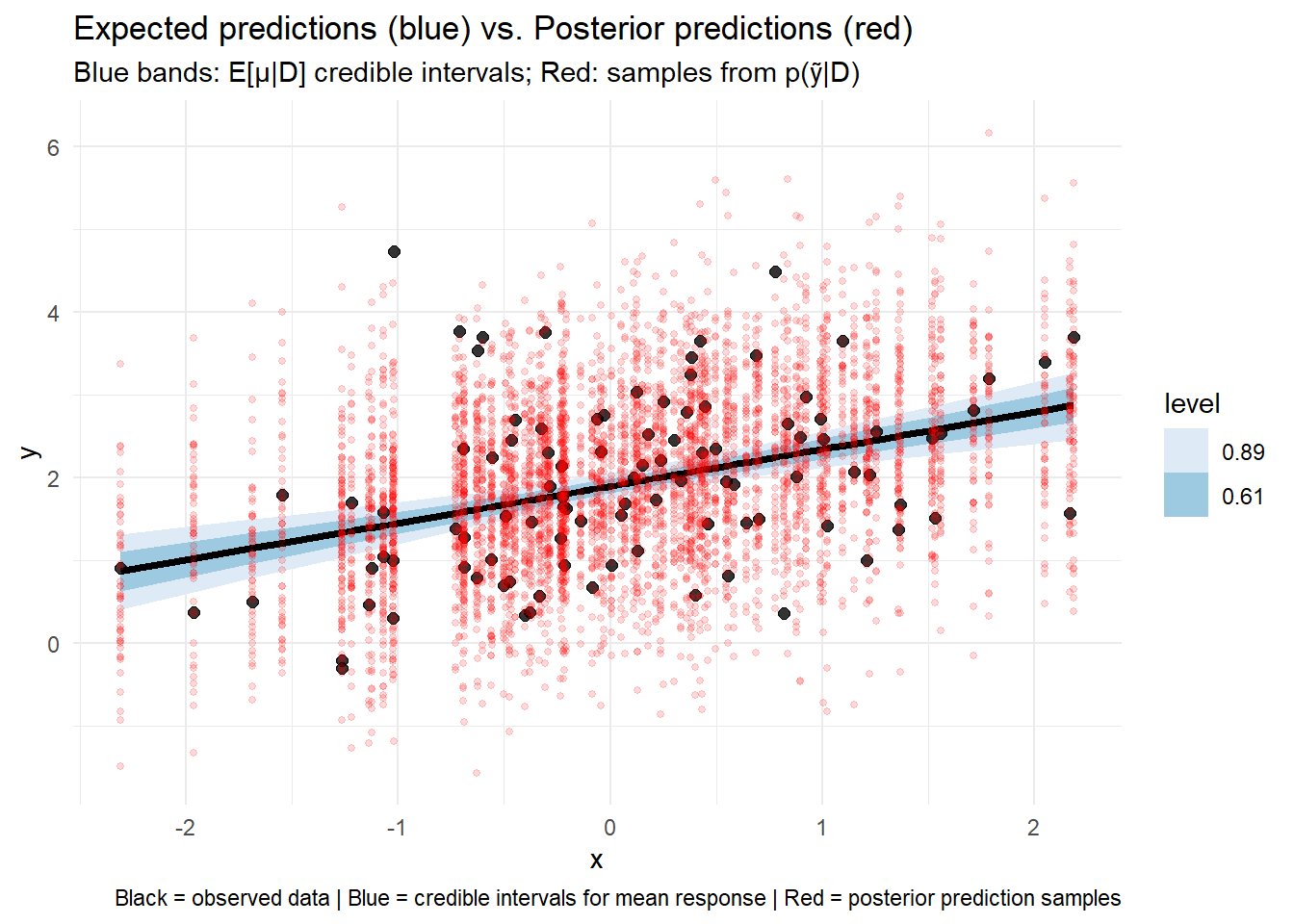 # Now we can extract both types of predictions:# - add_epred_draws(): posterior distribution of mean response p(μ|D)# - add_predicted_draws(): posterior predictive distribution p(ỹ|D)# Let's visualize both simultaneously:data |>add_epred_draws(fit) |>ggplot(aes(x = x, y = y)) +# Blue bands: credible intervals for E[μ|D]stat_lineribbon(aes(y = .epred), .width =c(0.61, 0.89)) +# Black points: observed datageom_point(data = data, size =2, alpha =0.8) +# Red points: 50 samples from p(ỹ|D) showing full predictive distributiongeom_point(data = data |>add_predicted_draws(fit) |>sample_draws(50),aes(y = .prediction),color ="red", alpha =0.15, size =1) +scale_fill_brewer() +labs(title ="Expected predictions (blue) vs. Posterior predictions (red)",subtitle ="Blue bands: E[μ|D] credible intervals; Red: samples from p(ỹ|D)",caption ="Black = observed data | Blue = credible intervals for mean response | Red = posterior prediction samples") +theme_minimal()